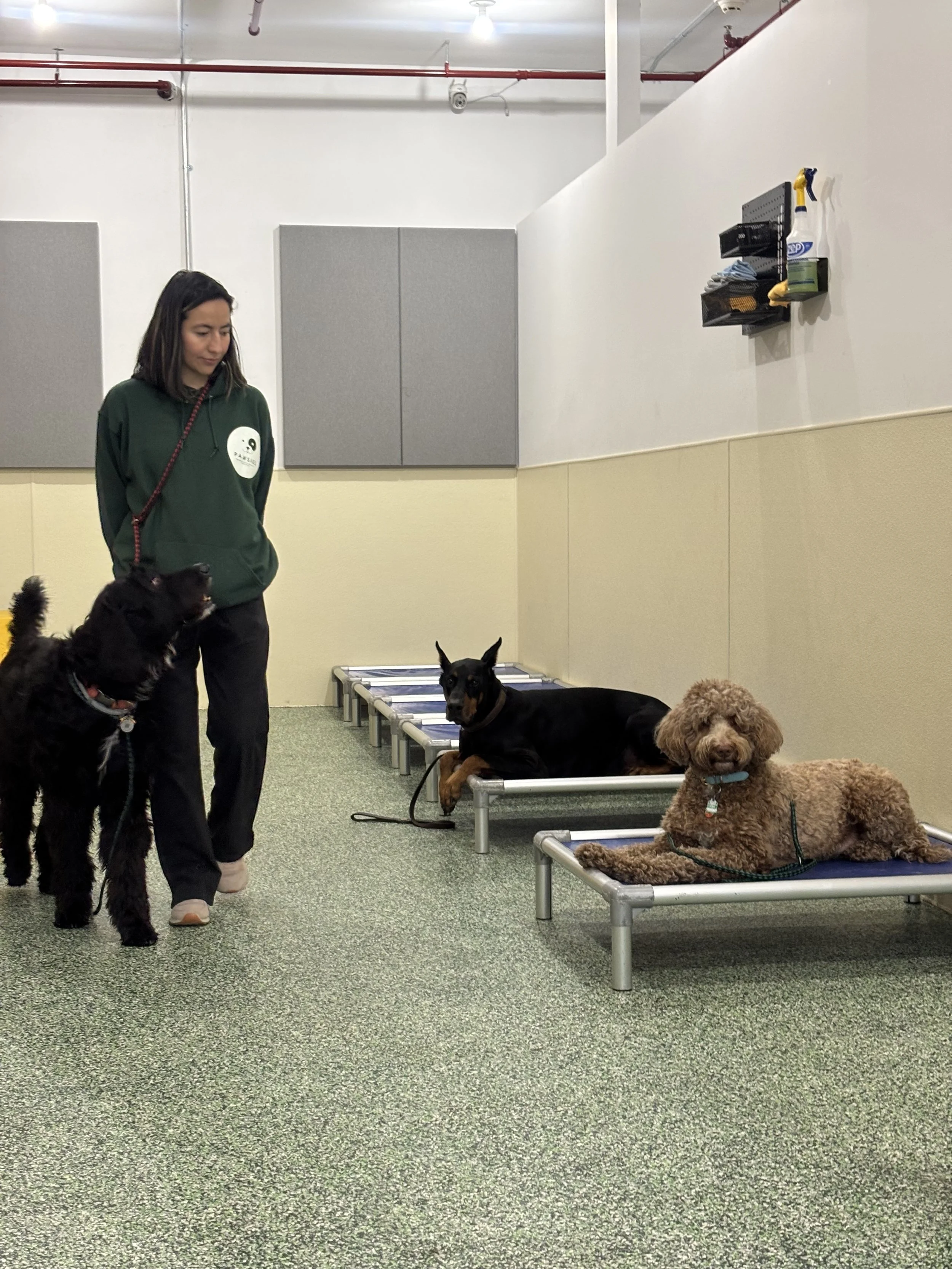 At daycare, we provide structured opportunities for dogs to practice calmness throughout their day. From controlled greetings to mindful walks and interactive play, each experience is designed to teach composure and build better habits. Over time, this approach helps dogs navigate their environment with ease and confidence, making walks, social interactions, and everyday routines more enjoyable for both dogs and their owners.